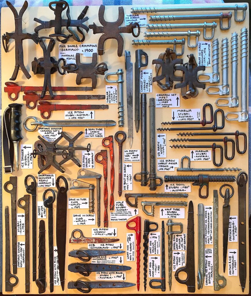 Marty Karabin says he did not find the climbing world. It is more like the climbing world found him. The gear in his collection somehow multiplies by itself as he sits still and witnesses one amazing coincidence after another as the historical gear finds preserving rest in his hands. Marty’s collection includes an assortment of carabiners, hammers, hand drills, hooks, pitons, nuts, cams, and more.