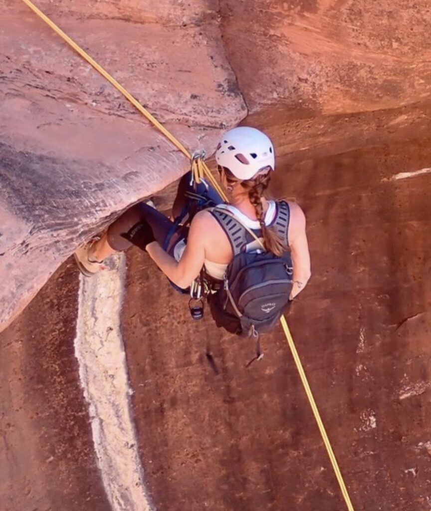 Make more room to turn sideways to look down at the rappel line. Very useful to going down waterfalls with heavy flow.